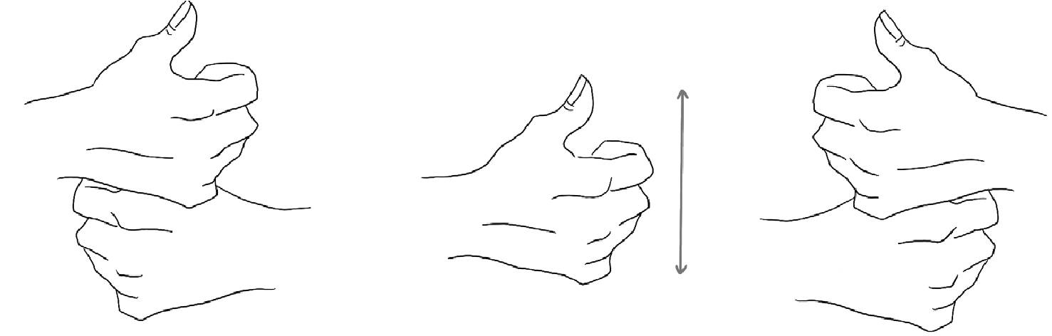Пальцы другой руки согнуты в кулак, большой палец в сторону, пальцы развернуты от себя.