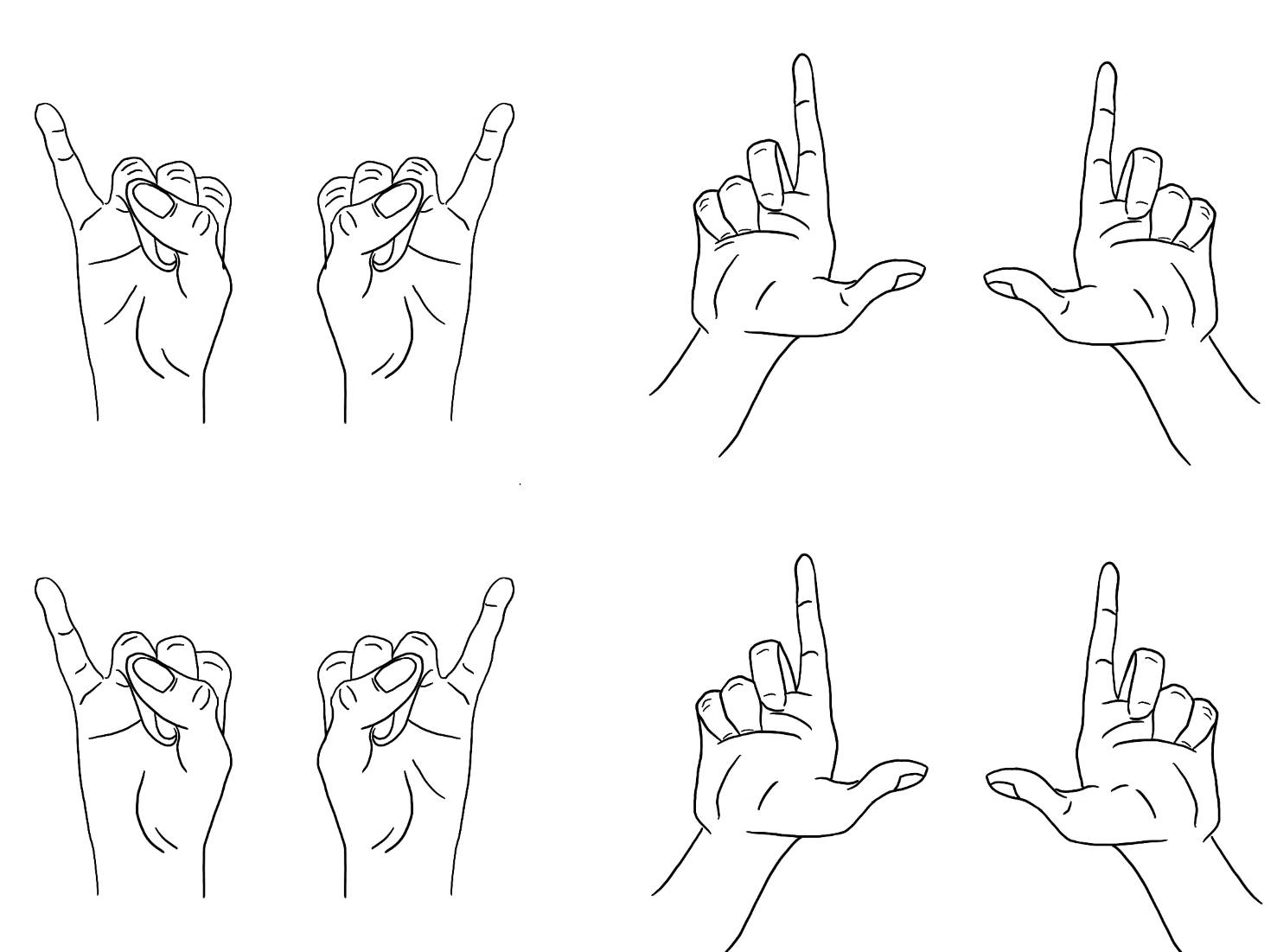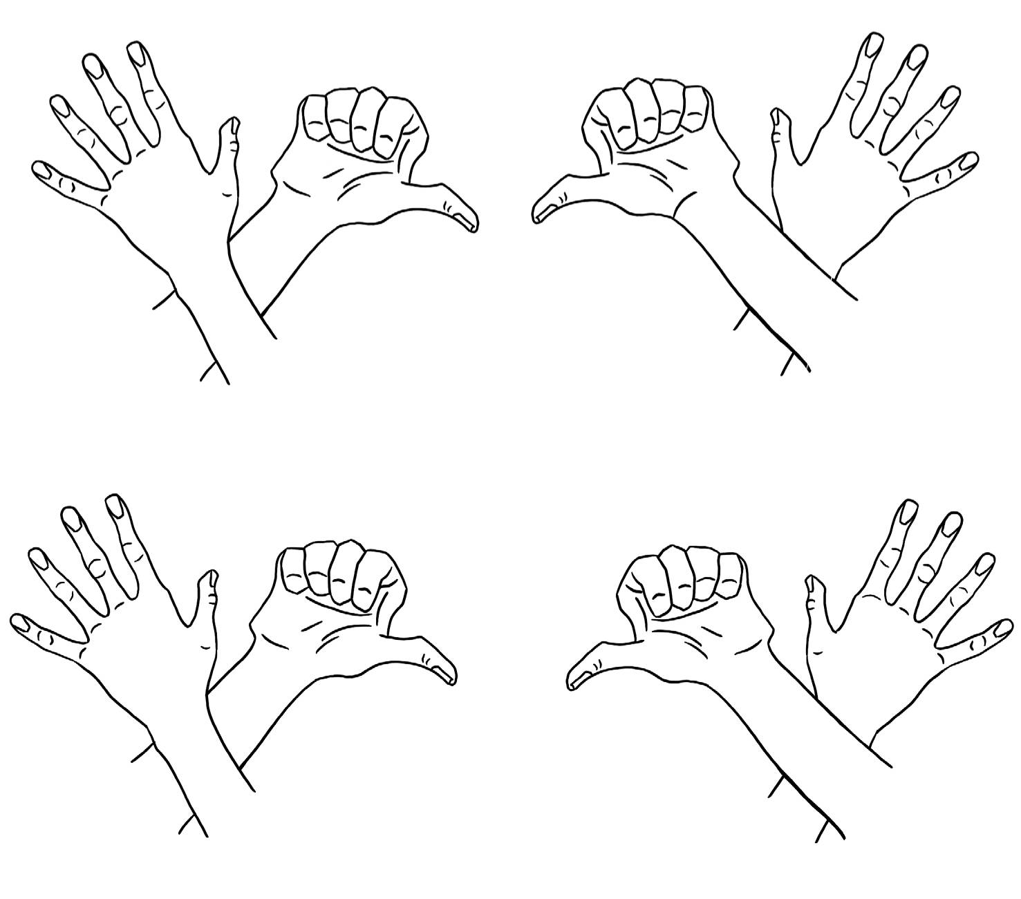 Затем чередуем: правая рука – поза 1 (большой палец в сторону), левая – поза 2 (указательный наверх) и меняем позиции.