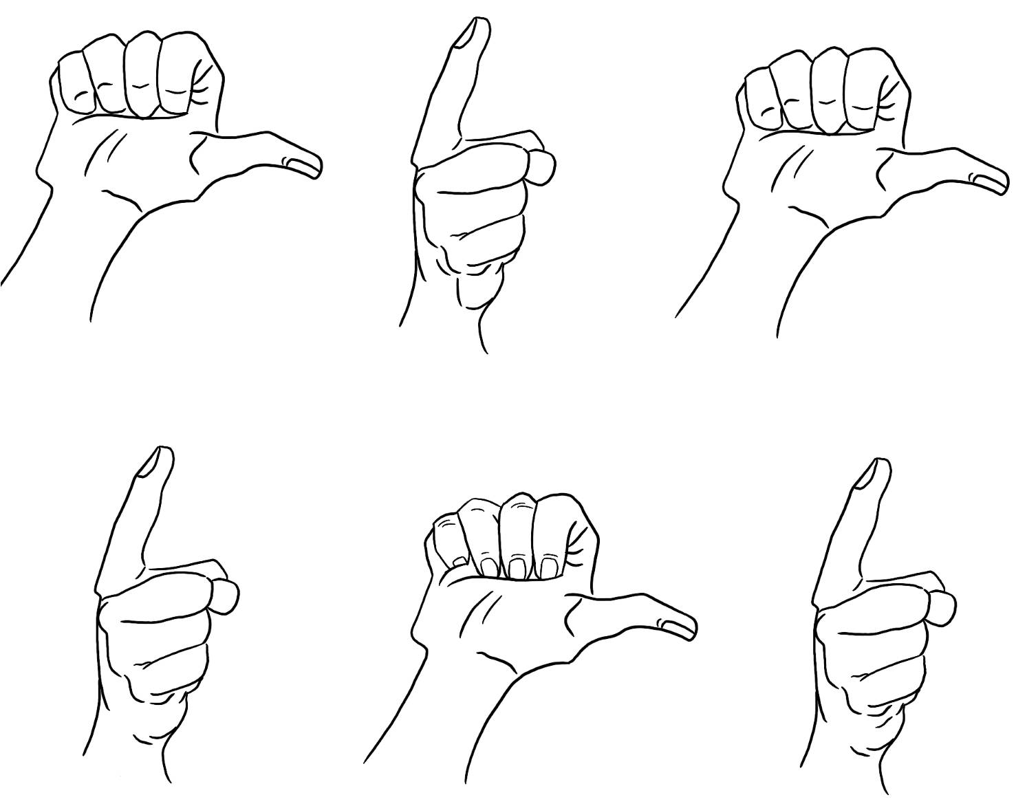 Выполняем сначала правой рукой: пальцы зажаты в кулак, большой палец в сторону – это поза 1. Поза 2 – пальцы зажаты в кулак, указательный наверх. И смена поз 1 и 2.
