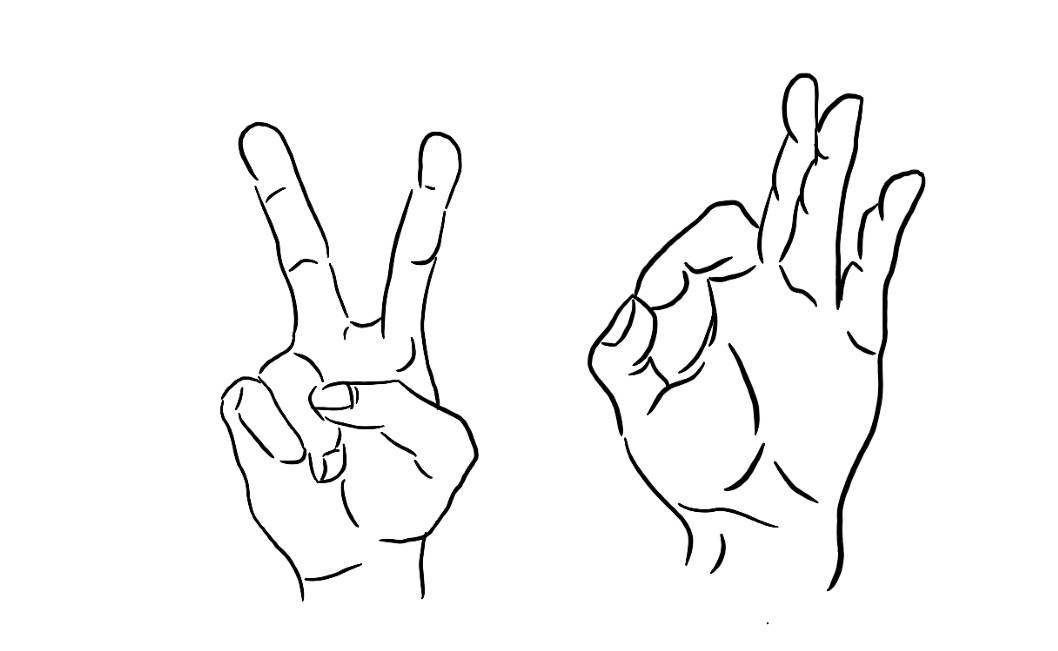 1 – «ОК» – большой и указательный палец сводим, образуя круг. Остальные пальцы наверх.