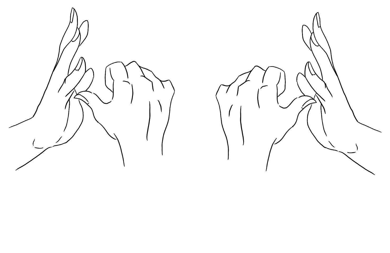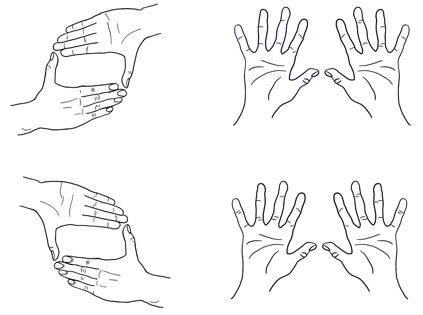 Выполняем поворот кистей так, чтобы большие пальцы обеих рук соприкасались с указательными («Фоторамка»), при этом одна кисть развернута ладонью к лицу, другая – тыльной стороной.
