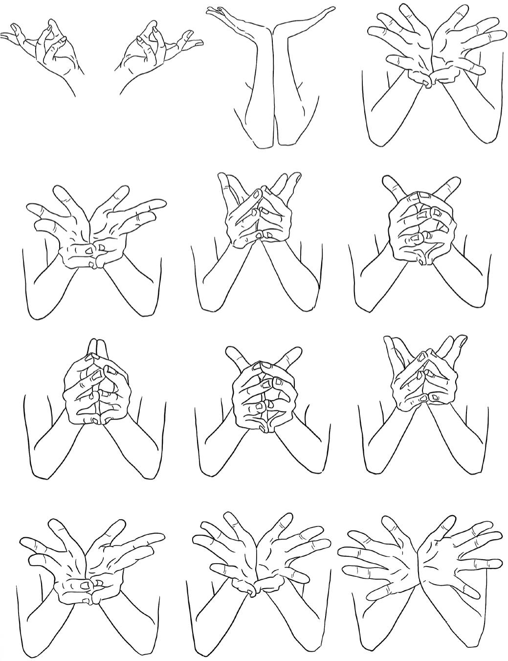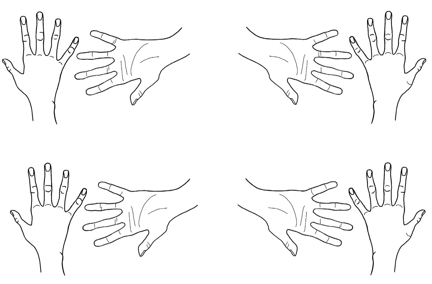 Большой палец одной руки соприкасается с центром ладони другой руки.