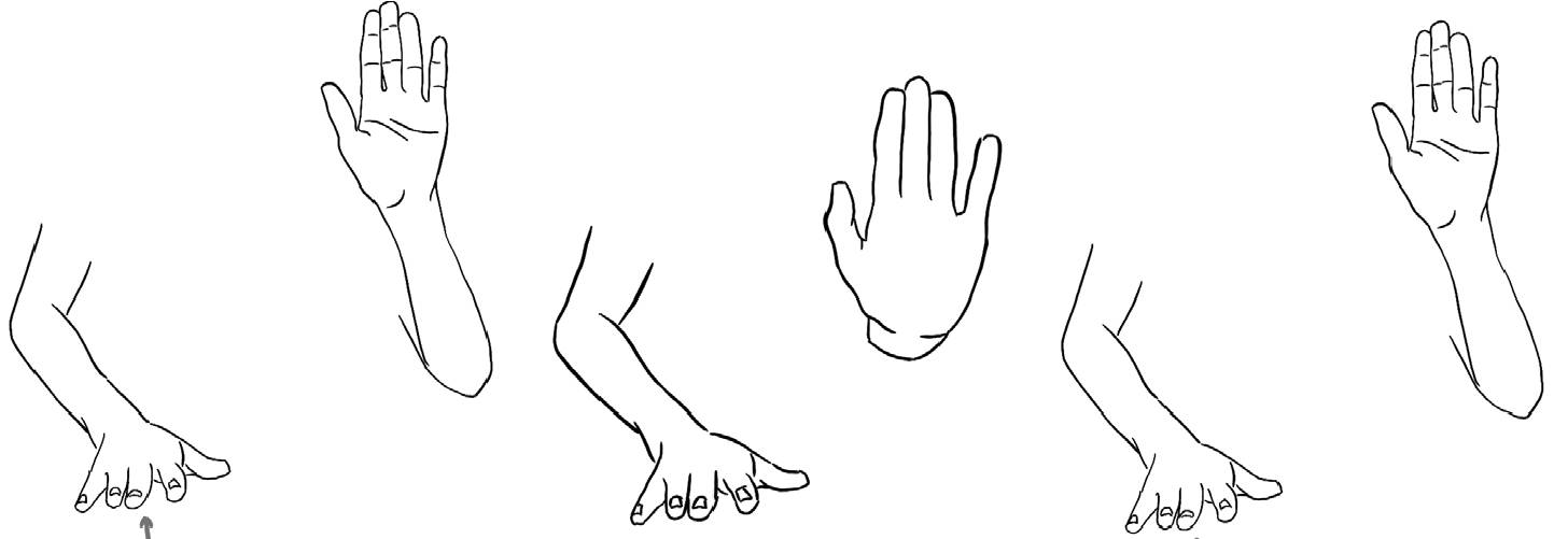 Правая рука повернута ладонью от себя, пальцы направлены вверх.