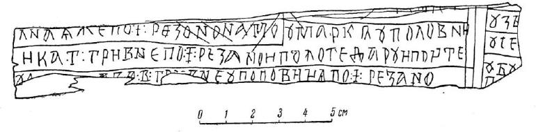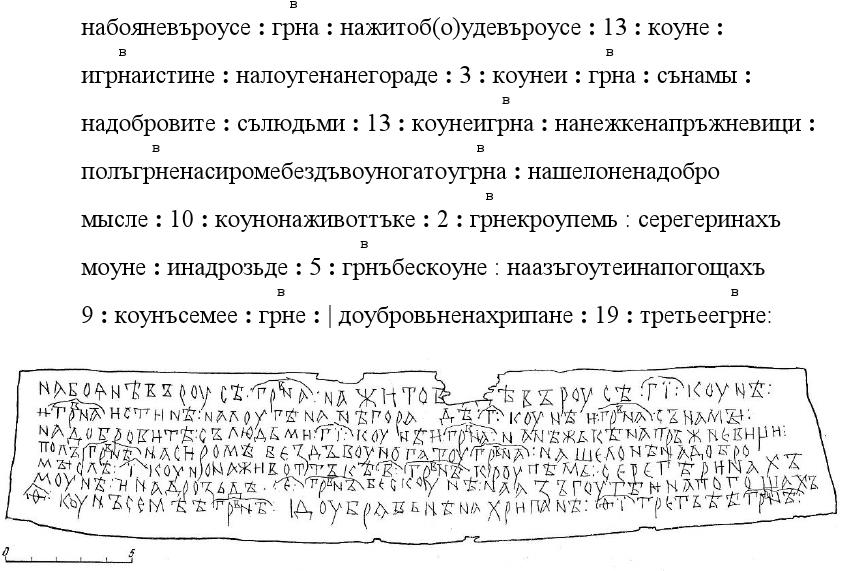 (1) Перевод: "на Бояне в Русе : гривна : на Житобуде в Русе :13 : кун : и гривна истины(займа) : на Негораде в Луге : 3 :куны : и гривна : с процентами : на Добровите : с людьми :13 : кун и гривна : на Нежке на Прожневиче : полгривны, на Сироме без двух ногатгривна: на Добромысле в Шелоне :10 : кун, на Животке : 2 :гривны крупьем (в Крупом?) : на Хмуне из Селигера : и на Дрозде :5 : гривен без куны : на Азгуте и на погощанах 9 : кун и семьгривен :| на Хрипане в Дубровне :19 : (кун) и три гривны: ".
