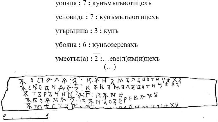 (1) Перевод: "У Опаля : 7 : кунъ в Молвотичах, у Сновида :7 :кунъ в Молвотичах, у Торчина : 3 : куны, у Бояна : 6 : кунъ в Озеревах, у Местка : 2 : (куны) в Велимичах…".