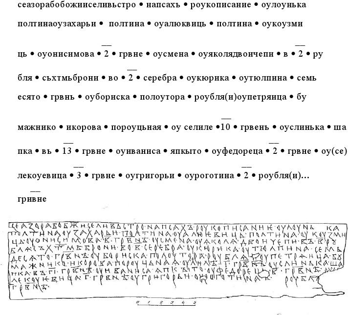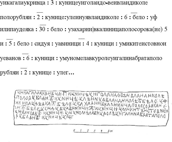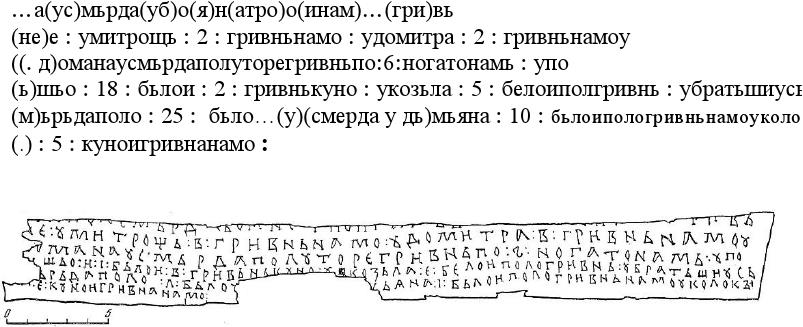 (1) Перевод: "…(а у с)мерда у Б)о(я)н(а тр)о(йные) проценты (2?) гривны, у Митрошки : 2 : гривны процентов, у Дмитра : 2: гривны процентов, у смерда у (Д)омана полторы гривны по : 6 : ногат процентов, у По(нь)ши : 18 : бел и : 2 : гривны кун, у Козьла : 5 : бел и полгривны, у Братьши у смерда : 25 : бел…(у) (смерда у Дь)мьяна : 10 : бел и полгривны процентов, у Колоки : 5 : кун и гривна процентов".