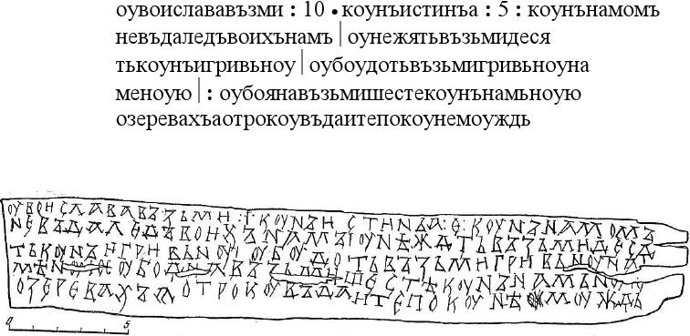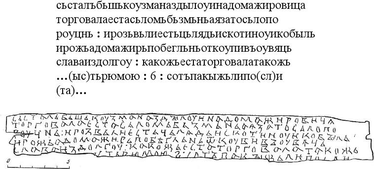 (1) Перевод: "Вот обвинил Кузьма Сдылу и Домажировича. Торговали вы селом без меня, а я за то село поручитель : И вывели из (села) челядь, и скотину, и кобыл, и (разделили) рожь, а Домажир бежал, не выкупив (имущество) у Вячеслава из долга : Как вы торговали, так и…(возместите) мой ущерб : 6 : сот (гривен) се(ребра); в противном случае пошлите…".