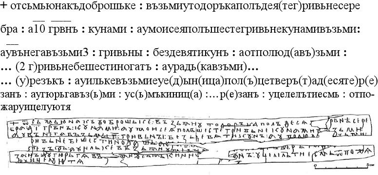 (1) перевод: "+ От Семьюна к Доброшке : Возьми у Тодорка десять с половиной гривен серебром : и 10 гривен : кунами : У Моисея шесть с половиной гривен кунами возьми : У Внега возьми 3 :гривны без девяти кун. От Полюда…возьми : (2 г)ривны без шести ногат : У Радька (возьми)…(у)резок : У Ильки Ме(д)ынича возьми десять и полчетверти резан: У Гюрьгия возьми :у Семкинича :…резан: А я вот уцелел от пожара и целую тебя".