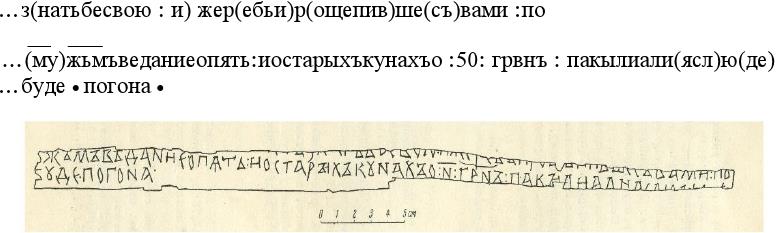 (1) Перевод: "знатьбе свою : и жеребьи росщепивши с вами : (Пошлите же (?) с этим (му)жем ведание опять : и по старым деньгам в : 50 : гривен : (вариант перевода: по 50 гривен старыми кунами). Иначе я посылаю детского, и будет погона •".