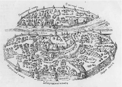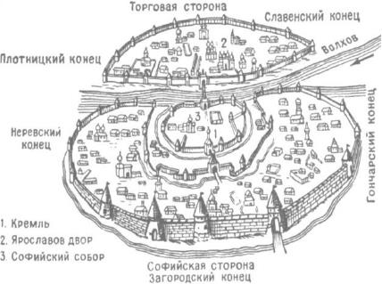 Новгород состоял из 5 административных районов (рис. 29): концы – Неревский, Славенский, Загородский, Гончарский (Людин), Плотницкий; стороны – Ярославово дворище, Софийская сторона, Торговая сторона; улицы – Великая, Холопья, Козмодемьянская, Ильина, Буяна, Розважа, Михайлова, Рогатица, Людогощая, Черницына, Славная, Пробойная, Нутная, Никитина, Щитная, Дубошин переулок. Планировка древних улиц не совпадает с современной.[75]