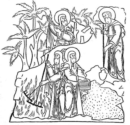 Рис. 31. Древнерусское сельское хозяйство: подсечное земледелие, посев, сбор урожая. [Летописная миниатюра].