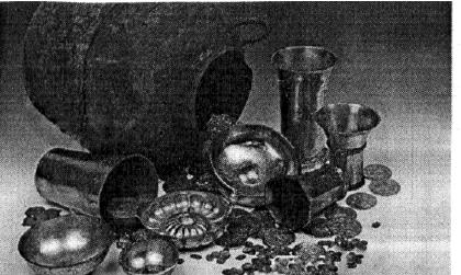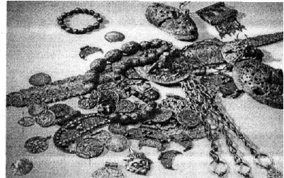 Рис. 34. Шведские клады с происхождением: византийское (монеты, посуда, стеклянные бусы, христианские культовые предметы) и скандинавское (женские украшения и оружие).