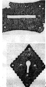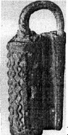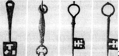Рис. 42. Великий Новгород. Железные изделия: 42.1. Замок навесной. (XII в.; 8,5 1 см); 42.2. Ключи от навесных замков (XI в.; 10,5 см; 12 см); Ключи от нутряных 3 замков (XII в.; 10,6 см;10,3 см); 42.3. Личины нутряных замков (XII в.; 13,3 см; 15 см).