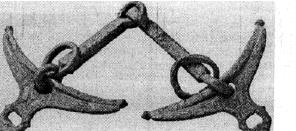 Рис. 43. Великий Новгород. Железные изделия: 43.1. Наконечник копья (X в., 35 см); 43.2. Топор боевой (XI в., 16 см); 43.3. Конские удила с псалиями (XI в.; серебряная инкрустация, ковка; 24 см); 43.4. Ножницы (XIV в.; 15,5 см); 43.5. Креса́ло (XI в.; ковка; 5 см); 43.6. Нож с бронзовой рукояткой (XIII в.; 14 см).