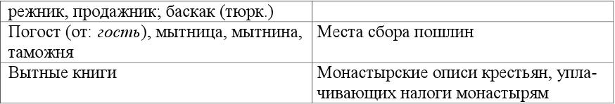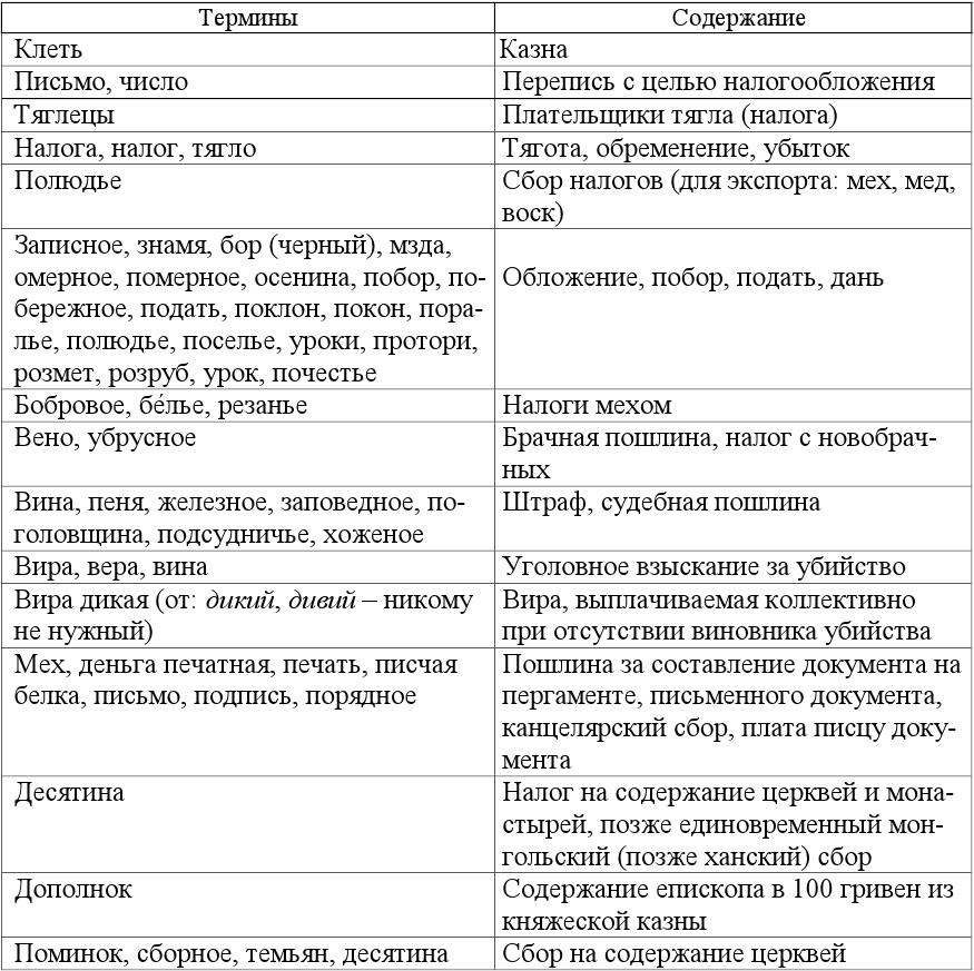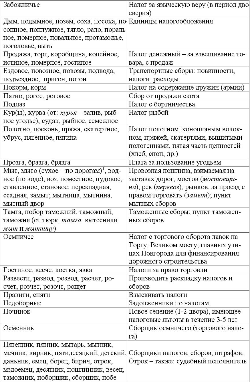 В сельском хозяйстве длительное время налоговой единицей служила соха, которая выражала определенную площадь пахотного поля / известное количество налогообязанных (тяглых)крестьянских дворов. В заисимости от налоговой единицы налогообложение называлось посошным, поплужным, поральным. Вообще, налогов и пошлин было много, и в совокупности они были обременительны. Отмечены злоупотребления, т. к. могло взиматься больше. Не уплачивали пошлины должностные лица, боярские дети, государственные гонцы. Древнерусский словарь терминов раскрывает разнообразие налогов и их обозначений (таблица 1).[111]
