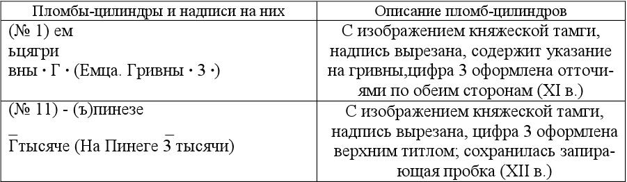 Меховые сборы упаковывались в особые мешки и пломбировались бирками-замками (более раннее название в истории берестяных грамот: пломбы-цилиндры) – деревянные цилиндры с отверстиями для шнура и с запирающей его пробкой, с краткой учетной записью и / именным знаком (мета), с указанием доли сборщика налога.[112] В ряде пломб цифры оформлялись отточиями / верхним титлом, что являлось средством ее обособленности от текста и учетной защиты, есть и представленные просто зарубками. Надписи могли стесываться в целях моногократного использования пломб-цилиндров (табл. 2, рис. 47).