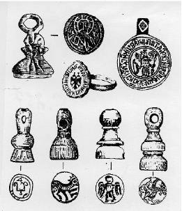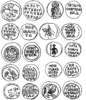 Большая часть русских средневековых печатей происходит из Новгорода – более 2000, что составляет 63 %.[115] Печати имели эмблемы (крест, святой, птица, хищник, воин, другие) и легенды (адресный текст):