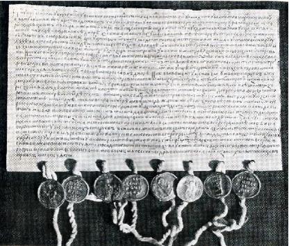 Документы высокого ранга (государственные, юридические, церковные, завещательные) заверялись вислыми печатями одного / нескольких ответственных (посадник, тысяцкий, епископ, купеческий староста), они крепились на шнурах к пергаменту сложными, в несколько ярусов узлами (рис. 50.2). Вислые печати были металлическими и восковыми.