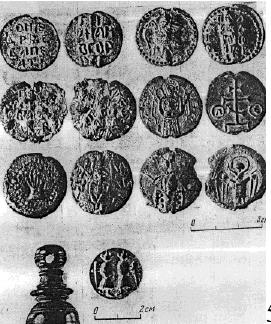 Сохранились также печати городской администрации и межевщиков. Архив официальных документов функционировал в течение XI–XVI вв. Полагают, что при Иване IV он был уничтожен. В конце XVIII в. на этом месте был вырыт канал, в насыпи которого современные археологи нашли вислые свинцовые печати, оставшиеся от несохранившихся документов (свыше 700). Большинство печатей относится к XII–XIII вв. (рис. 50).