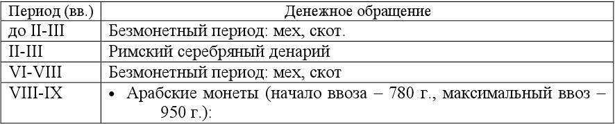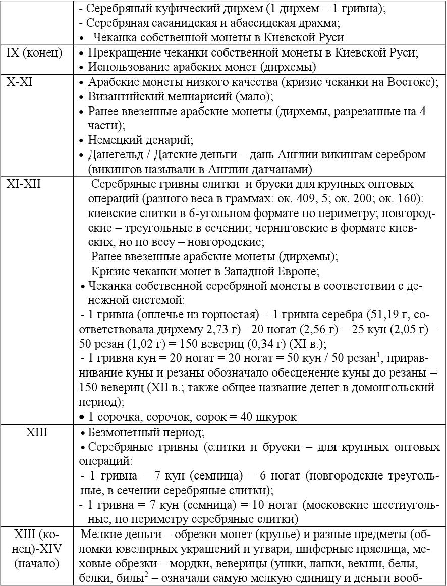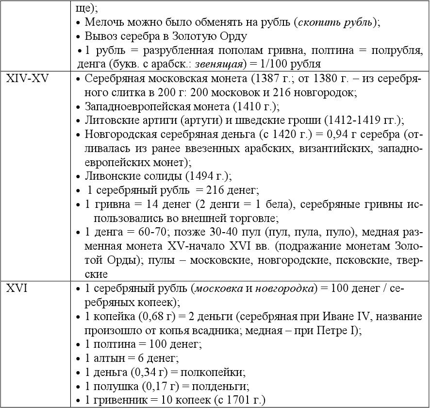 Эволюция денежного обращения Древней Руси и Новгорода по имеющимся историческим исследованиям (существует несколько версий в связи с множественностью и неустойчивостью весового содержания, номинаций, названий) позволяет обобщить ее следующим образом[116] (табл. 3).