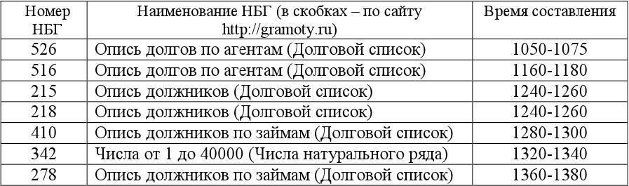 Документы производят профессиональнее впечатление ясным текстом и учетной определенностью. Они имеют общие учетные признаки, несмотря на разницу в 100 лет [НБГ 526; XI в. и НБГ 516; XII в., НБГ 410; XIII в. и НБГ 278; XIV], что свидетельствует об устойчивых стереотипах: формализованное представление информации: денежное [НБГ 526; XI в., НБГ 516; XII в.], натурально-денежное [НБГ 215; XIII в., НБГ 218; XIII в.], цифровое оформление во всех документах; применение графоклеток [НБГ 215 и 218], но вообще чрезвычайно редко. Все документы содержат остатки (инвентарный тип записей), т. е. перечни остатков, извлеченных из текущего учета:… пять гривен на…ах. На Влищеве гривна (и) три гривны и семь с половиной кун. На Дуйцине гривна и полторы гривны [НБГ 958; XI в.]. Остаток можно определить лишь на основе текущего учета прихода и расхода (денежных средств, товаров, расчетов) и проконтролировать инвентаризацией.