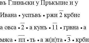 оу Мила гривена : оу Михаля гривен(а) : оу Ильике д(в)ове гревене оу Косниледове :оу К(л)опоуше дове гревене : оу (Яр)ине гривена :оу Поутиле гривена…(оу)…(гр)ивена : `оу Снови(д)е гривена : `оу Неговита поло(гривене) [БГ 19 из Старой Руссы; XII в.];