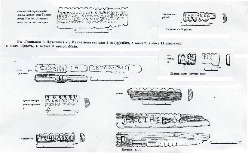 Найденные в новгородских раскопках бирки XI–XIV вв. (рис. 60) являются персонифицированными, так как в них указаны конкретные лица. Цифровая информация в бирках представлена зарубками разной конфигурации (соответственно видам учетных объектов), а текстовая информация – учетными измерителями. После заполнения бирка раскалывалась так, что получалось два одинаковых экземпляра – для кредитора и для должника. При погашении долга бирки уничтожались. Известен также вариант со стесанными зарубками на бирках из Старой Руссы. Степень грамотности должника не имела особого значения, но он мог обратиться и к профессиональному песцу (писцу).