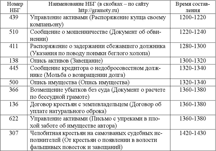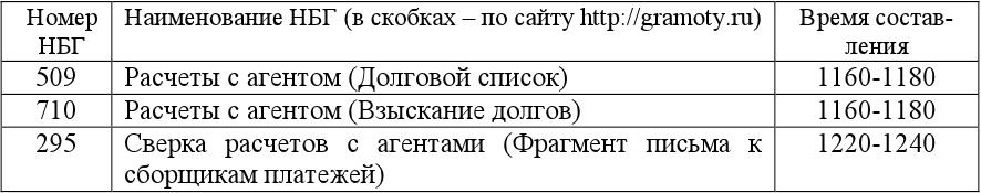 НБГ с деловыми сообщениями и поручениями, если они содержат также и учетный пласт (формализованный по тексту, учетным измерителям, с учетным оформлением цифр) правомерно квалифицировать как документы управленческого учета. Документы управленческого учета имеют общие признаки с документами бухгалтерского учета, но с тем отличием, что содержат дополнительную распорядительную информацию управленческого характера. Дополнения в документах такого типа интересны и другими деталями: ссылка на пожар в Новгороде (а я вот уцелел от пожара и целую тебя), распоряжения по займам и процентам (возьми, дайте), о выплате отроку платы, расщепление жеребья, ссылки на знатьбу, ведание, детского. Стереотип такого документа содержал перечень имен, сумм, мест, распоряжений [НБГ 1057; XII в.]: