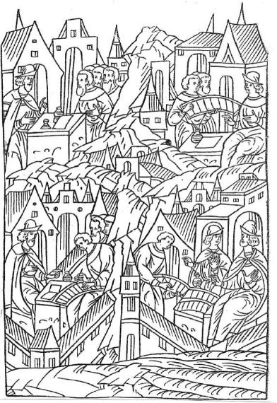 Рис. 62. Налоговые описи. Столбцы (XV в.): ведомости (листы), кодексы (книги) и свитки (в свитках изображены горизонтальные линии – условные рисунки записей / подготовка для размещения записей); чернильницы и трости для письма. [Летописная миниатюра].