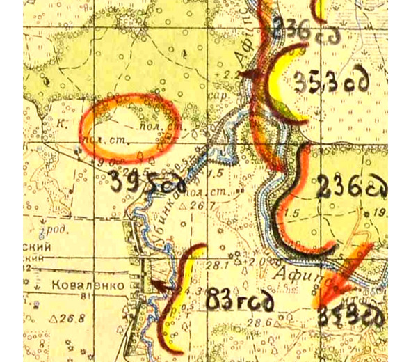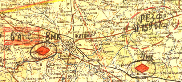 Фрагмент рабочей карты оперативного отдела штаба ЮЗФ с 4 по 9 июля 1941 г. (Берёзовка за флажком штаба 6-й армии)