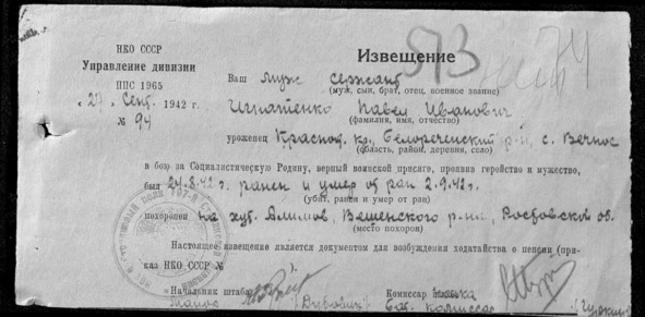 «Похоронка» на П. И. Игнатенко, которая, возможно по ошибке, была отправлена в Красноярский край
