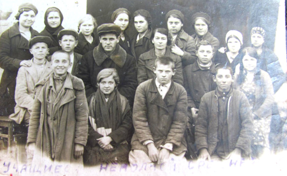 1940 г. 7 класс школы №24 Бжедуховского совхоза. Вася Локтионов второй слева в среднем ряду