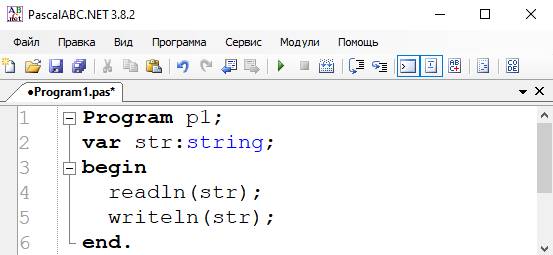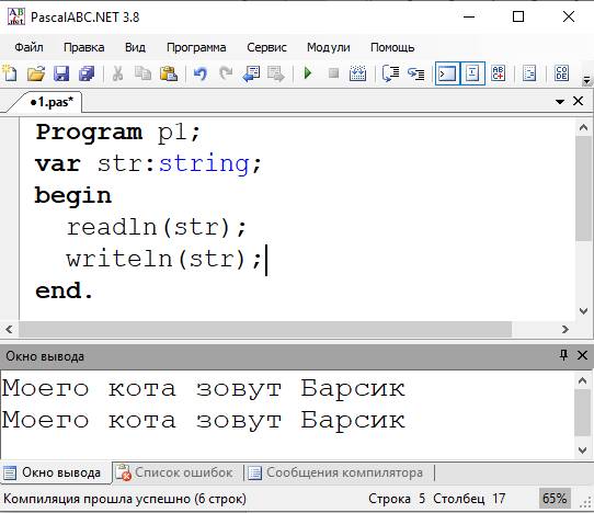 Таким образом, оператор readln() используется для ввода значений переменных с клавиатуры. В нашем случае оператор readln(str) позволил ввести с клавиатуры значение переменной str, строку ‘Моего кота зовут Барсик’.