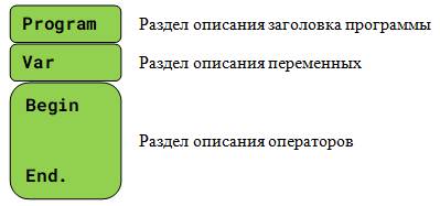 Раздел заголовка программы Program содержит название программы p1. Название программы должно начинаться с буквы и не может содержать пробелы. Вы можете придумывать различные названия для своих программ, например: Program Game1.