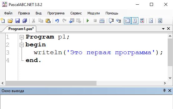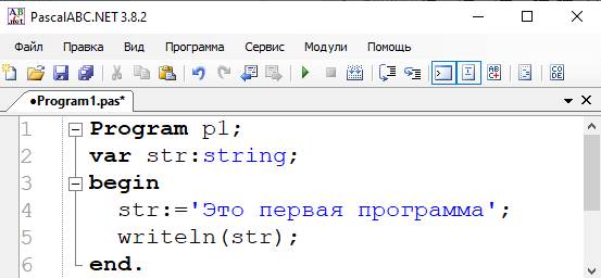 Раздел описания операторов содержит оператор writeln(‘Это моя первая программа’). В языке Паскаль оператор writeln() используется для вывода сообщений на экран. В нашем случае сообщением является строка ‘Это первая программа’. Строки в языке Паскаль заключаются в одинарные апострофы.