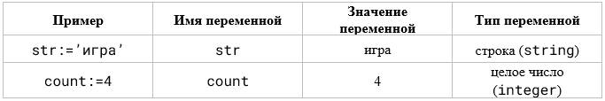 Слева от символов «двоеточие равно» записывается имя переменной, а справа выражение (например, арифметическое, строковое, логическое и др.)