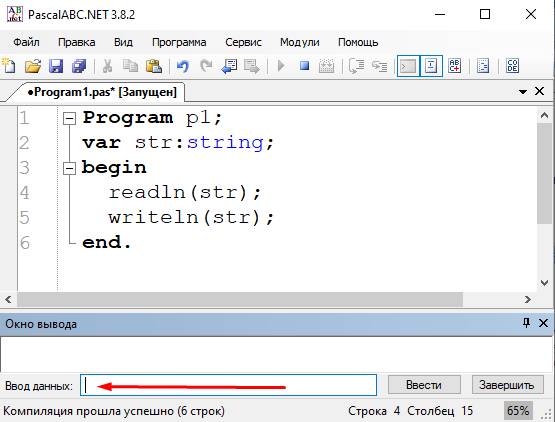Запустите программу на выполнение. В окне вывода появится строка для ввода значений (это выполняется оператор readln). Введите строку ‘Моего кота зовут Барсик’ и нажмите клавишу Enter.