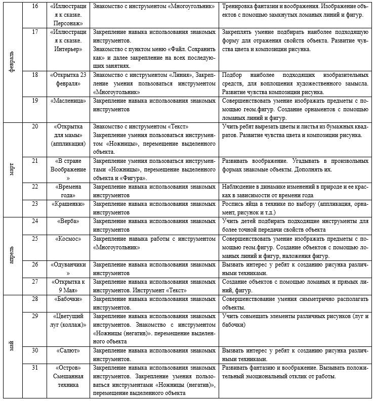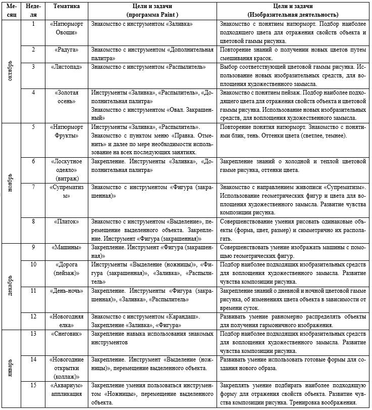 На данный момент цикл «Компьютерное рисование» включает в себя 31 занятие различной тематики, на которых дети подготовительной группы учатся рисовать с помощью компьютерной программы «Paint» (лучше использовать старую версию программы без вкладок, например, версию 5.1, т.к. она проще и нагляднее).