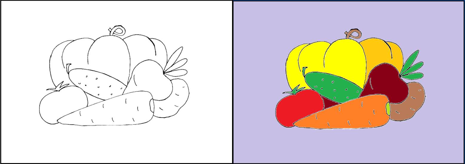 – учить детей предавать характерные особенности цвета и оттенков овощей, за счет использования подходящих инструмента программы «Paint» («Заливка»).