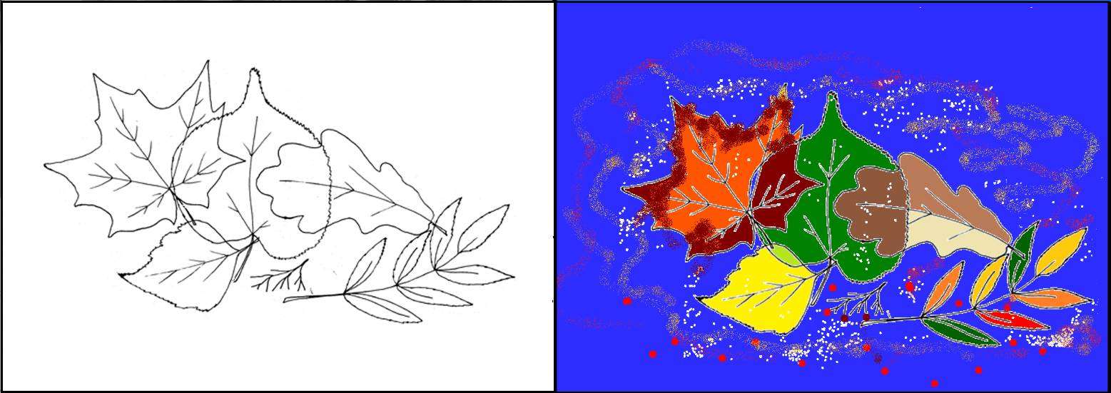 Материалы: Осенние листья (береза, дуб, клен, рябина с гроздью, липа), Программа «Paint», картина (натюрморт) с готовыми контурами листьев: рябины, дуба, клена, липы, березы (контуры пересекаются).