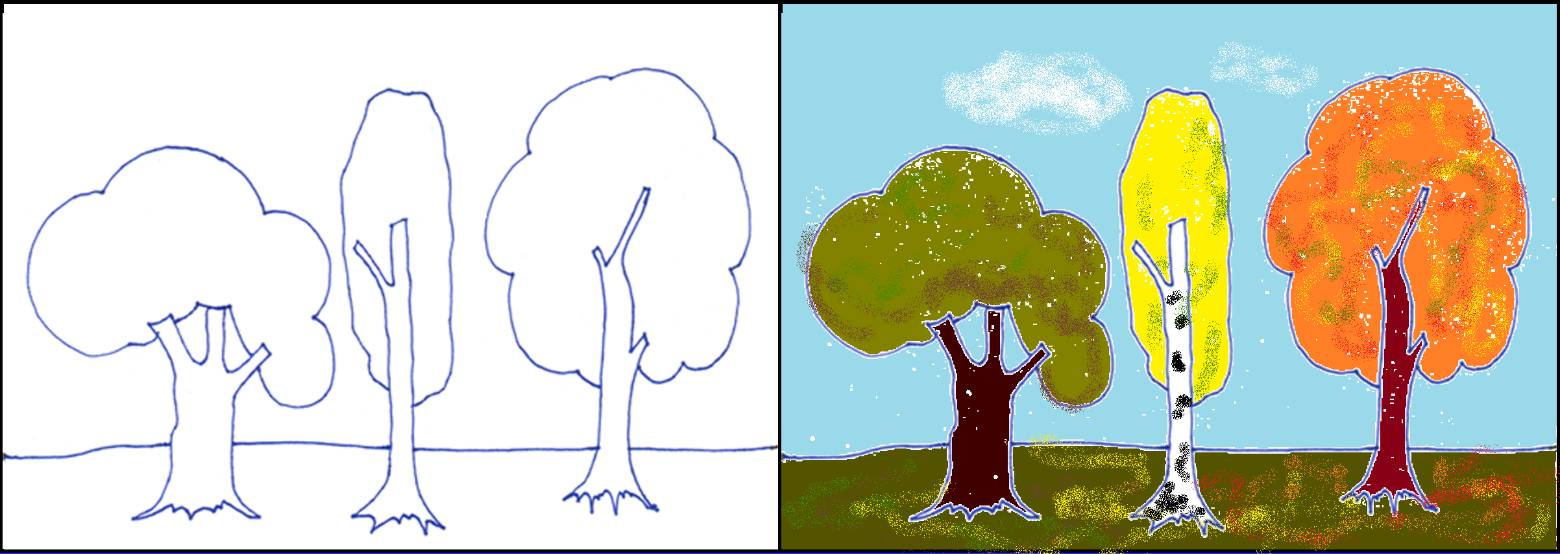 Раскрасить стволы деревьев: у осины – коричневым, у дуба – черным, используя «заливку»; ствол березы – используя «напыление».