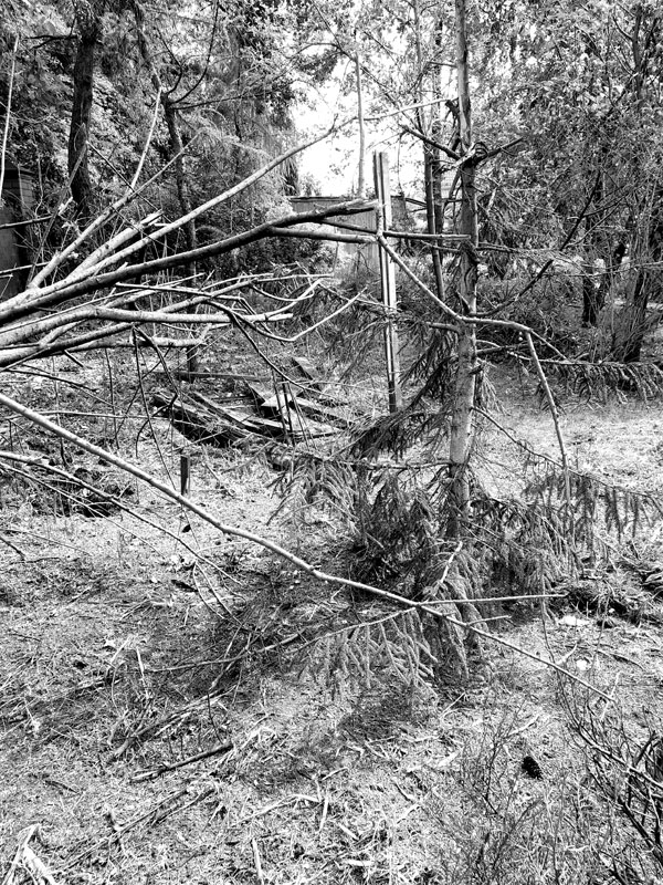В полёте снаряд ударил толстенный ствол древовидного можжевельника – переломившись, тот рухнул. В ужасе считаю потери: около пятнадцати взрослых деревьев лишилось крон или погибло. Садовую решётку забросило на сосну у забора. Вся эта часть сада испещрена ямами от крупных осколков. Теплица разбита.
