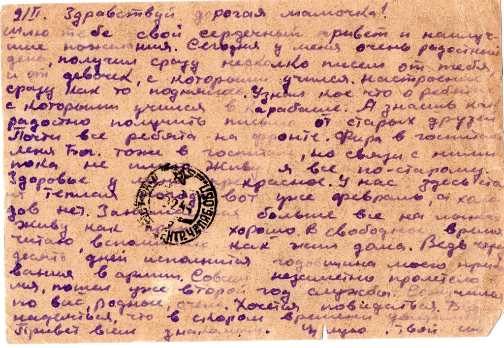 Шлю вам свой горячий привет и наилучшие пожелания в вашей жизни. Несколько дней уже не получал от вас писем, да и вообще в последнее время письма получаю совсем редко. Сегодня получил от вас перевод на 300р. После занятий пойду в город на почту. Живу я все по-старому. Жив и здоров. Здоровье у меня хорошее. Сейчас здесь у нас погода стоит такая, какая у нас на Урале бывает в конце марта. На улице совсем тепло, с крыш течет вода. Занимаемся мы в классах. В выходной день ходим в город и смотрим фильм «Похождения Швейка». Недавно начал изучать краткий курс истории партии. Уже изучил и законспектировал первую главу. Вот и все чем я занимаюсь. Писем ни от кого из ребят давно не получал. Если о ком что знаете, напишите. Передайте привет всем знакомым. Целую вас крепко.