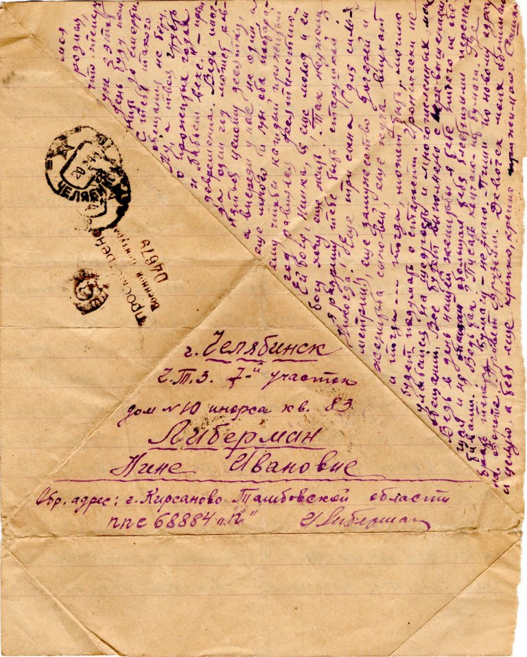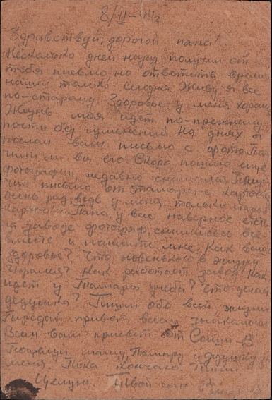 Получил письмо от Тамары с карточками, очень рад, ведь у меня только старые карточки. Папа, у вас, наверное, есть на заводе фотограф, снимитесь все вместе и пошлите мне. Как Ваше здоровье? Что новенького в жизни Уфалея? Как работает завод? Как идет у Тамары учеба? Что делает дедушка? Пиши обо всей жизни.