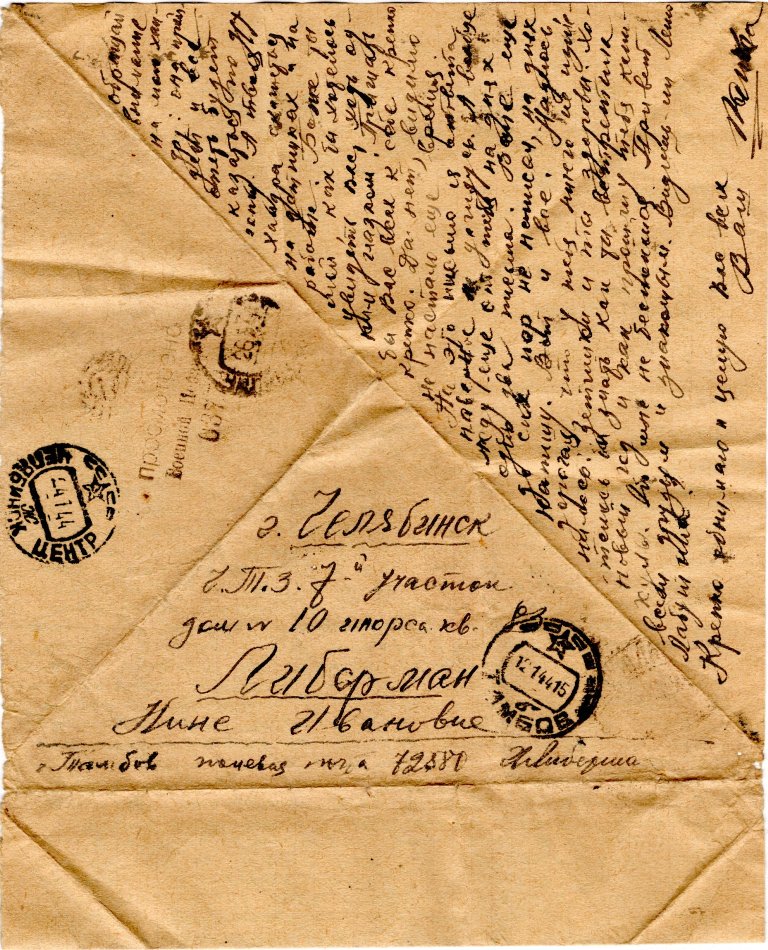 Обращаюсь к сестренке Маруси ты в письме просиш мою фотокартку, учтите что я нахожусь не в тылу а на фронте что здесь никакой нет возможности фотографироваться передавай прывет всем девчатом и сообщаю что твое письмо получил которое писала Ганна Ц. благадару девчат за прывет что не забывают меня.