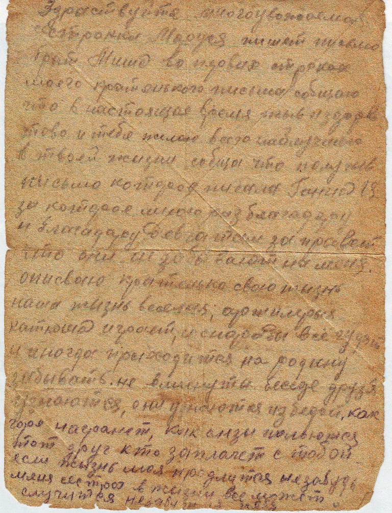 Здравствуйте родители Мамаша Дядя и сестренка Маруся пишет письмо ваш сын Миша во первых хочу сообщить что я пока што нахожусь жив и здоров тово и вам желаю всего наилучшего в вашей домашней жизни. Нахожусь в восточной пруссии на территории немца. Сообщаю что ваши письма получил все которыя вы мне посылали и последнее время получил 8 писем и на эти письма даю вам ответ сообщаю что получыв письмо от братеника Караня Степана Павлов я с ним имею переписку.