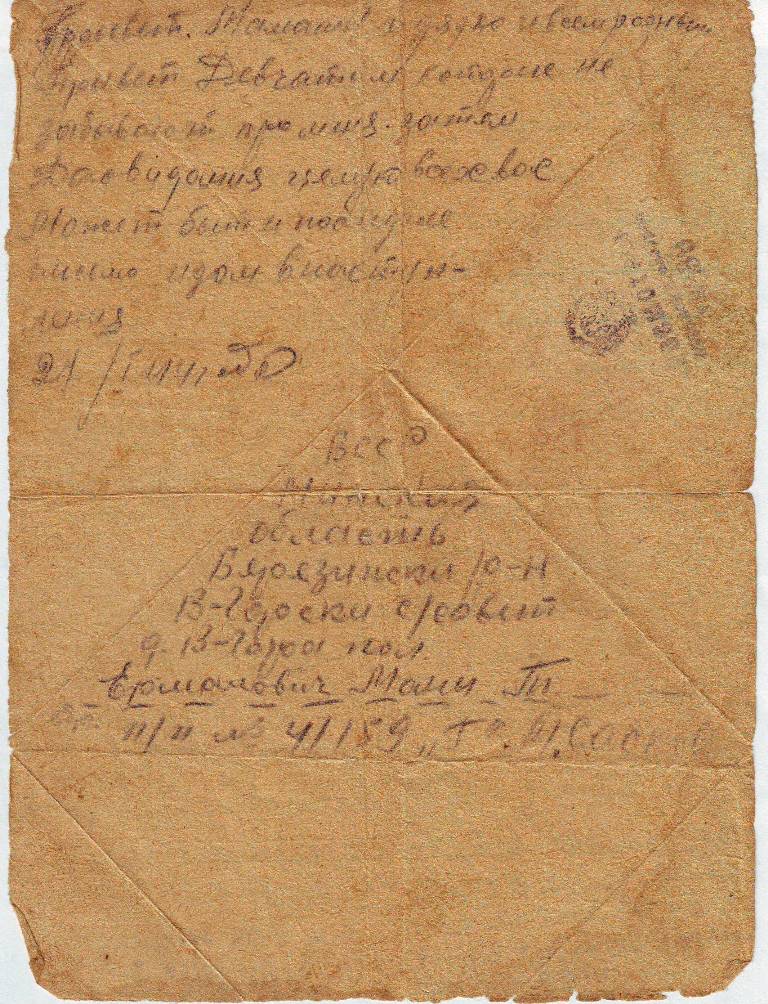 Привет Мамашы и дядю и всем родным. Привет Девчатам которые не забывают про меня. Затем Дасвидания целую всех вас. Может быт и последнее письмо идом в наступление