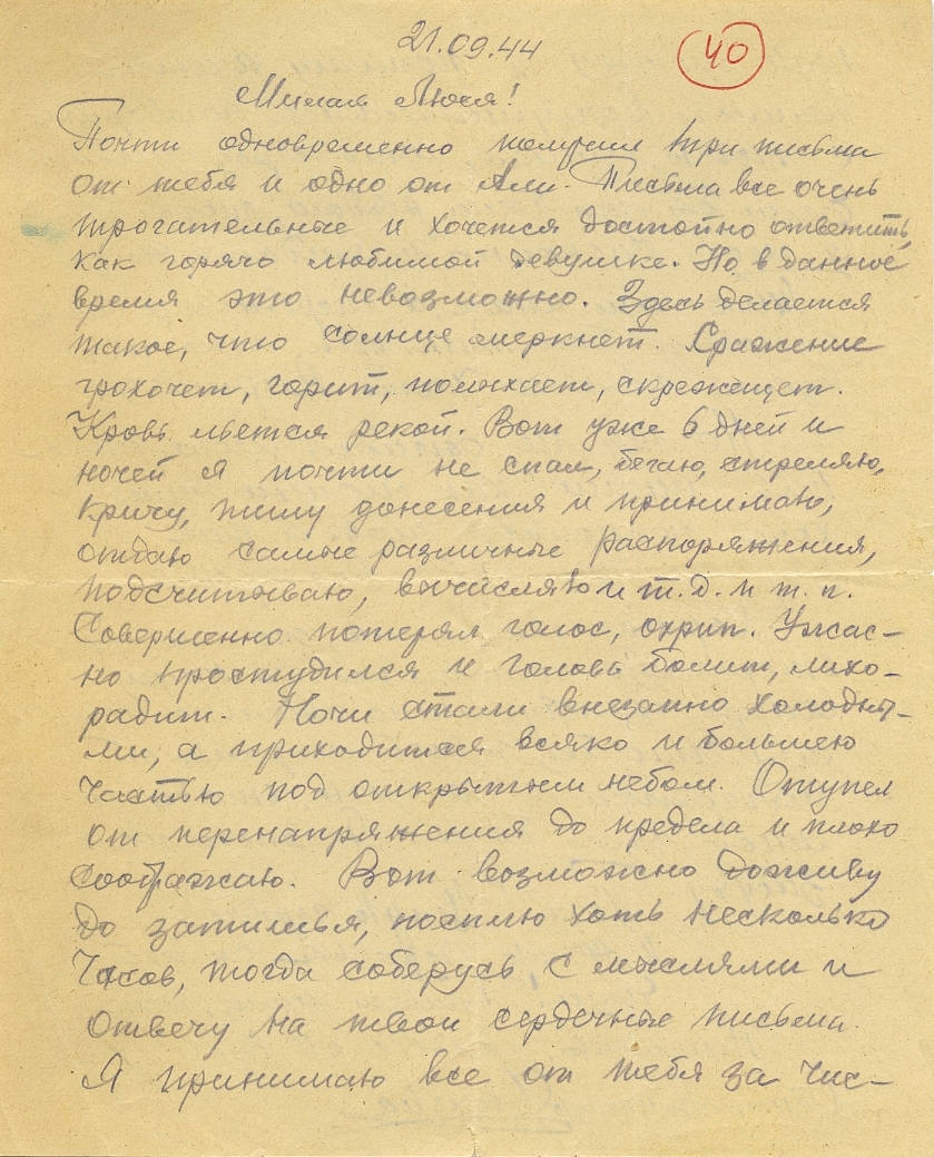 Хотел дождаться хотя бы относительной передышки, чтобы собраться с мыслями и толком ответить, моя любимая, на твои хорошие и сердечные письма. Но как видно этого не дождусь. Сегодня получил страшный удар: ранен мой непосредственный начальник, у которого я заместителем. Принимаю его бразды «ухожу вперед в самый ад корректировать огонь. Чем всё это кончится – не знаю. Кроме того имею за 5 дней 10 человек убитыми из подчиненных. Трудно передать тебе то, что у меня на сердце, на душе, в голове, хотя в прошлом пережил и не такое. Сколько пришлось отдать сил и времени, чтобы обучить погибших людей! И вот приходят письма от их матерей. Руки дрожат и сердце сжимается, когда подумаешь, что я наделаю там у них дома своими ответами.