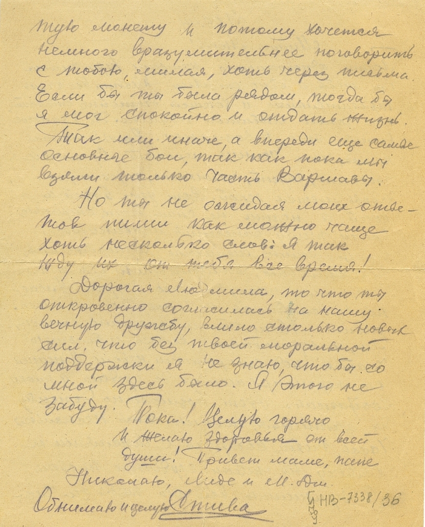 Почти одновременно получил 3 письма от тебя и одно от Али. Письма все очень трогательные и хочется достойно ответить как горячо любимой девушке. Но в данное время это невозможно. Здесь делается такое, что солнце меркнет. Сражение грохочет, горит, полыхает, скрежещет. Кровь льется рекой. Вот уже 6 дней и ночей я почти не спал, бегаю, стреляю, кричу, пишу донесения и принимаю, отдаю самые различные распоряжения, подсчитываю, вычисляю, и т.д. и т.п. Совершенно потерял голос, охрип. Ужасно простудился и голова болит, лихорадит. Ночи стали внезапно холодными, а приходится всяко и большей частью под открытым небом. Отупел от перенапряжения до предела и плохо соображаю. Вот, возможно, доживу до затишья, посплю хоть несколько часов, тогда соберусь с мыслями и отвечу на твои сердечные письма. Я принимаю всё от тебя за чистую монету и потому хочется немного вразумительнее поговорить с тобою, милая, хоть через письма. Если бы ты была рядом, тогда бы я мог спокойно и отдать жизнь. Так или иначе, а впереди ещё самые основные бои, так как пока мы взяли только часть Варшавы.