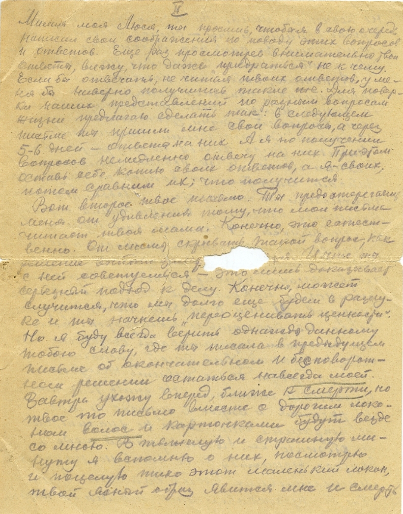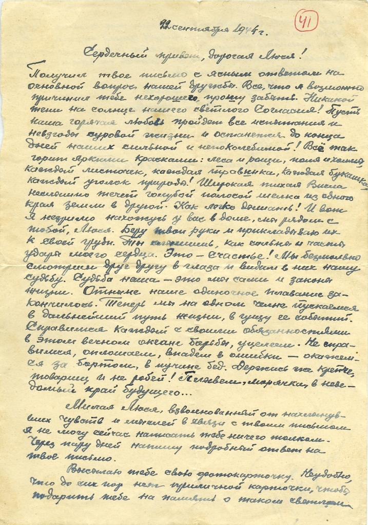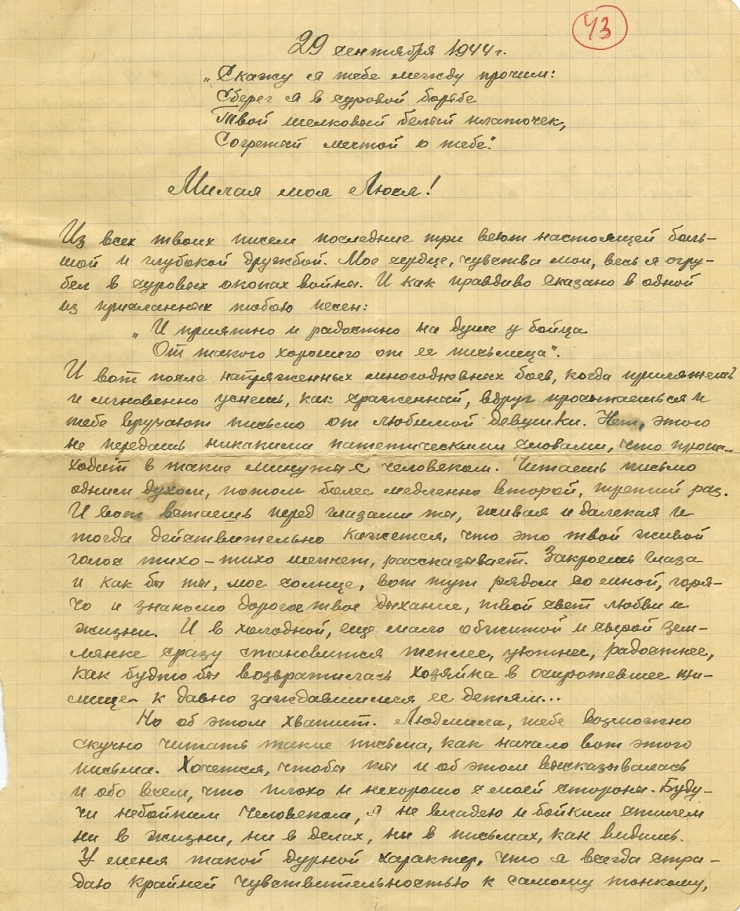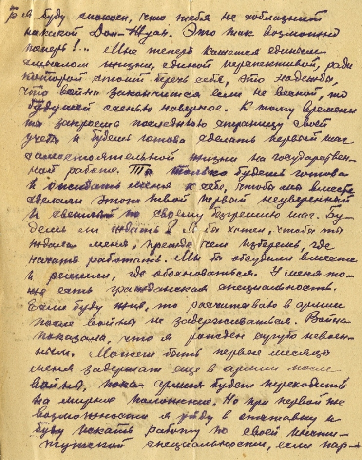 Милая Люся! Видимо, скоро ты возобновишь занятия на своем последнем курсе. Не знаю, чем заполнены твои дни сейчас, но с началом занятий время полетит у тебя скорее и я тебе в этом отношении завидую. Здесь так медленно тянется время! Снова, как бывало, ты будешь спешишь из дому на занятия, снова отдашься праведному делу науки и строгой дисциплины, как и прошлую зиму… И если это будет так, то я буду спокоен, что тебя соблазнит никакой Дон-Жуан. Это так возможно теперь!… Мне теперь кажется единым смыслом жизни, единой перспективой, ради которой стоит беречь себя, это надежды, что война закончится если не весной, то будущей осенью наверное. К тому времени ты закроешь последнюю страницу своей учебы и будешь готова сделать первый шаг самостоятельной жизни на государственной работе. Ты только будешь готова к ожиданию меня к себе, чтобы мы вместе сделали этот твой первый неуверенный и светлый по своему безгрешию шаг. Будешь ли ждать? Я бы хотел, чтобы ты ждала меня, прежде чем изберешь, где начать работать. Мы обсудили вместе и режим, где обосноваться. У меня тоже есть гражданская специальность. Если буду жив, то рассчитываю в армии после войны не задерживаться. Война показала, что я рождён сугубо невольным. Может быть первые месяцы меня задержат ещё в армии после войны. Пока армия будет переходить на мирное положение. Но при первой же возможности я уйду в отставку и буду искать работу по своей институтской специальности, если партия не направит на другую работу. Мы уедем куда-нибудь на юг, ближе к Черному морю. Подробно это обсудим потом. Рассчитываю, что остановим свой выбор на Одессе. Но может быть Кисловодск, Пятигорск или Крым нас устроит. В Одессе у меня родная тётя, сестра мамы, я её уже разыскал и они с нетерпением жду меня в гости. Пишут и ждут меня друзья в Москву, в Ленинград, на Кавказ. Лишь бы скорее конец войне!